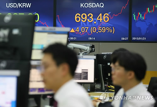 | △ 코스닥, 장중 690선 돌파 (서울=연합뉴스) 김도훈 기자 = 코스닥이 장중 690선을 넘어선 14일 오전 서울 중구 외환은행 본점 딜링룸에서 직원들이 업무를 보고 있다. 코스닥 지수가 690선을 넘은 것은 2008년 1월 15일 장중 고점 696.11을 나타낸 이후 처음이다. 종가 기준으로는 2008년 1월 11일(699.24)이 마지막이다. |