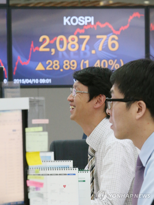 | △ 코스피 활짝 (서울=연합뉴스) 서명곤 기자 = 코스피지수가 전날보다 28.89포인트(1.40%) 오른 2,087.76으로 거래를 마감한 10일 오후 서울 중구 명동 외환은행 본점 딜링룸에서 한 딜러가 활짝 웃으며 대화를 나누고 있다. 이날 지수는 종가 기준으로 2011년 8월 2일(2,121.27) 이후 가장 높은 수준이다. 코스닥지수는 전날보다 5.06포인트(0.75%) 오른 682.02로 마감했다. 지수가 680선을 넘어선 것은 2008년 1월 14일 이후 처음이다. 2015.4.10 seephoto@yna.co.kr |