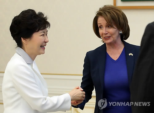 | △ 인사하는 박 대통령과 낸시 펠로시 (서울=연합뉴스) 도광환 기자 = 박근혜 대통령이 2일 오후 청와대를 방문한 낸시 펠로시 미국 하원 민주당 대표를 만나 악수하며 인사하고 있다. 2015.4.2 dohh@yna.co.kr |