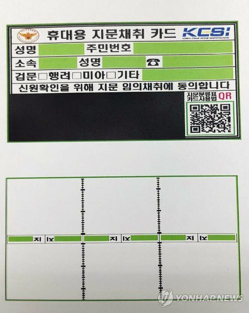 명함 크기인 이 카드 앞면에는 먹지가 붙어 있고, 뒷면은 지문이 잘 찍히도록 접착성 물질을 바른 흰색 종이로 돼 있다.