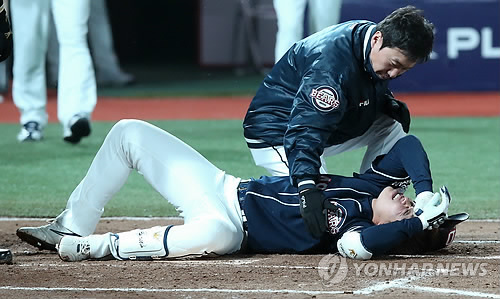 한동안 쓰러져 있던 민병헌은 잠시 후 일어나 1루로 걸어나갔다.