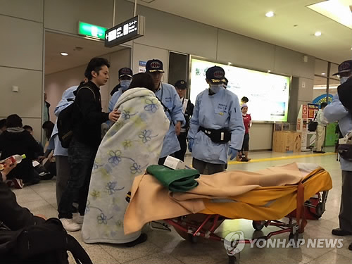 | △ 병원 이송되는 탑승객들 (서울=연합뉴스) 아시아나항공 여객기가 일본 히로시마 공항에 착륙하면서 활주로를 벗어나는 사고가 발생한 14일 일본 구급대원들이 승객들을 병원으로 옮기고 있다. 2015.4.15 << 독자 제공 >> photo@yna.co.kr |