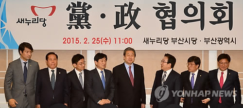 | △ 새누리 부산시당 당정협의회 (서울=연합뉴스) 백승렬 기자 = 새누리당 김무성 대표 등 부산지역 의원들과 서병수 부산시장이 25일 국회에서 열린 부산시당 당정협의회에서 취재진에 포즈를 취하고 있다. 왼쪽부터 문대성·배덕광·김세연·유재중 의원, 김무성 대표, 서병수 부산시장, 이진복·이헌승 의원. 2015.2.25 srbaek@yna.co.kr |