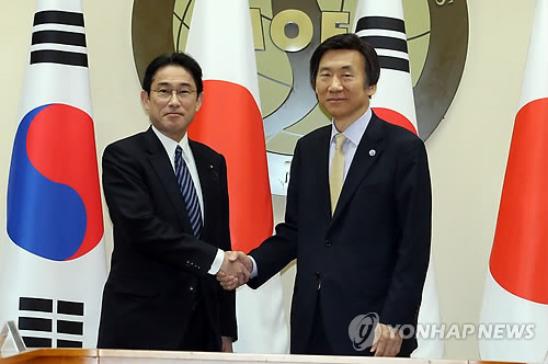 | △ 윤병세 외교부 장관(오른쪽)과 기시다 후미오 일본외무상이 지난달 21일 서울 도렴동 외교부에서 열린 한일외교장관 회담에서 악수하고 있다. |