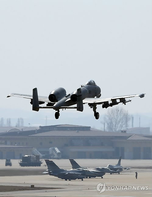 | △ 착륙하는 A-10 (평택=연합뉴스) 배정현 기자 = 3일 오후 경기 평택시 오산 미공군기지에서 A-10 항공기가 착륙하고 있다. 2013.4.3 doobigi@yna.co.kr |