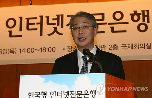 | △ '인터넷은행' 세미나 참석한 임종룡 금융위원장 (서울=연합뉴스) 김주성 기자 = 취임 한 달을 맞은 임종룡 금융위원장이 16일 오후 서울 명동 은행회관에서 금융연구원 주최로 열린 '한국형 인터넷 전문은행 도입방안 세미나'에 참석해 축사를 하고 있다. utzza@yna.co.kr |