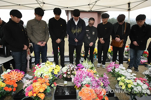 | △ 고 남윤철 교사 찾아온 단원고 제자들 (청주=연합뉴스) 황정현 기자 = 세월호 참사 1주년인 16일 오후 청주시 상당구 가덕면 천주교 공원묘지. 세월호가 침몰하던 마지막 순간까지 배에 남아 학생들을 구조하다 유명을 달리한 고(故) 남윤철 교사가 잠든 이곳에 그가 첫 담임을 맡았던 제자들이 찾아와 추모하고 있다. |