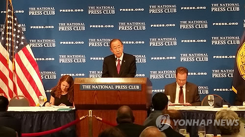| △ 미국 내셔널프레스클럽에서 연설하는 반기문 유엔 사무총장 (워싱턴=연합뉴스) 김세진 특파원 = 반기문 유엔 사무총장이 16일(현지시간) 워싱턴DC 내셔널프레스클럽 주최 만찬에서 연설하고 있다. 2015.4.17. smile@yna.co.kr |