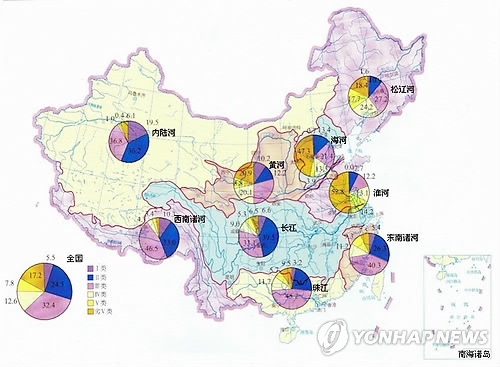 | △ 중국, 7대강 수질개선 '수십조' 발표 (베이징=연합뉴스) 진병태 특파원 = 중국 정부가 2020년까지 창장(長江), 황허(黃河) 등 7대 중점유역의 수질 개선을 위한 야심찬 계획을 발표했다. 중국의 7대 중점유역 수질개선사업은 국내총생산(GDP) 증가분이 5조7천억위안(1천조원)에 이를 것으로 예상돼 향후 5년간 중국의 경기회복을 이끄는 견인차 역할을 할 수 있을 것으로 기대된다. 사진은 중국 수질지도. 동부연안 지역의 수질오염이 심각한 상태다. 2015.4.17 << 바이두 >> jbt@yna.co.kr |