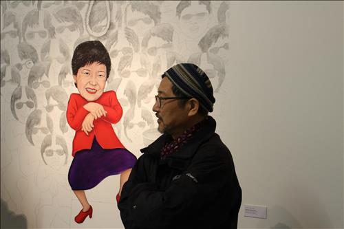 표현의 자유를 강조하며 검열에 저항하는 의미로 '금지된 그림'이란 타이틀을 내건 이번 전시회에는 한국에서 민중미술로 유명한 홍 작가와 북한 사회를 풍자해온 탈북 작가 선무가 작품을 내놓았다.