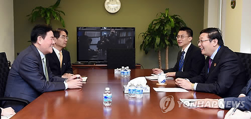 | △ 최경환, 러우 지 웨이 중국 재무장관과 양자회담 (서울=연합뉴스) IMF/WB 춘계회의 및 G20 재무장관회의 참석차 미국 워싱턴을 방문중인 최경환 경제부총리 겸 기획재정부 장관이 17일(현지시간) 세계은행(WB)에서 러우 지 웨이 중국 재무장관과 양자회담을 하고 있다. (기획재정부 제공) |