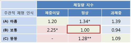 연구팀은 조사 대상자를 체질량지수(BMI)에 따라 체중미달(BMI 18.5 미만), 표준(18.5이상~25미만), 과체중(25 이상)으로 나누고, 자기 체형을 어떻게 평가하는지에 따라 또 마름, 보통, 뚱뚱함으로 나눴다.