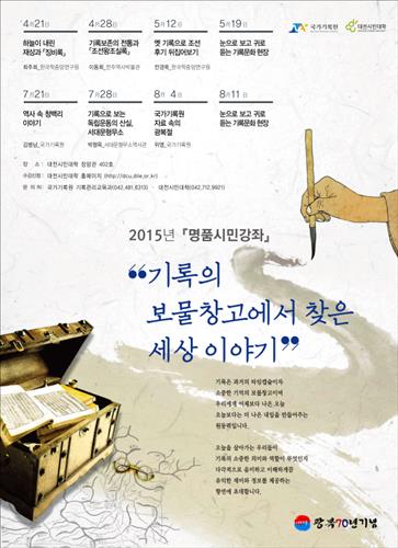 (서울=연합뉴스) 이정현 기자 = 행정자치부 국가기록원은 21일부터 다음 달 18일까지 대전 시민대학에서 '명품시민강좌 - 기록의 보물창고에서 찾은 세상이야기' 강좌를 운영한다고 19일 소개했다.