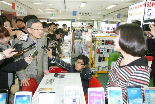 (서울=연합뉴스) 윤보람 기자 = 최성준 방송통신위원장이 19일 주말 전산 개통 이후 이동통신 유통업계 상황을 점검하겠다며 서울 광진구 테크노마트를 찾았다.