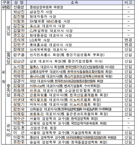 3기 위원은 중견기업 위원 2명이 새로 추가되고 중소기업 위원이 9명에서 11명으로 2명 늘어난 것이 특징이다.