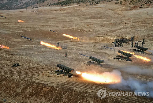 | △ 2013년 3월 노동신문이 보도한 북한 김정은 국방위원회 제1위원장 참관하에 실시된 연평도·백령도 타격 포 사격훈련 장면 (연합뉴스 자료사진) |