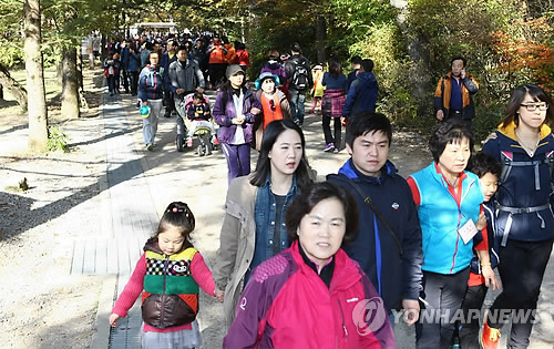 | △ 속리산 탐방로 걷는 관광객들 (보은=연합뉴스) 박병기 기자 = 지난해 가을 속리산을 찾은 관광객들이 황토 포장된 탐방로를 걷고 있다. 국립공원관리공단 속리산사무소는 관광객 편의를 위해 내년까지 법주사∼세심정 구간에 새 탐방로를 개설할 계획이라고 21일 밝혔다. bgipark@yna.co.kr |