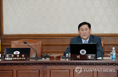 | △ 최 부총리, 국무회의 주재 (서울=연합뉴스) 전수영 기자 = '성완종 리스트' 의혹에 휩싸인 이완구 국무총리가 중남미 순방중인 박근혜 대통령에게 사의를 표명한 가운데 최경환 경제부총리겸 기재부장관이 21일 오전 정부서울청사 국무회의장에서 회의를 주재하고 있다. |
