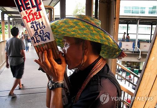 | △ (AP=연합뉴스 자료사진) 태국 방콕 전철역 인근에서 전통 악기를 공연 중인 악사. |