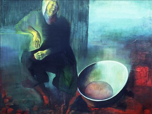 옷차림과 약간 일그러진 듯 보이는 얼굴에 왠지 모를 고단함이 묻어나고 바닥에는 물건을 담는 데 쓰이는 큰 그릇이 놓여 있다.