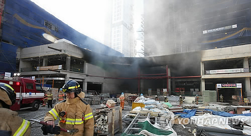 불길이 잡힌 후에도 신축 공사장 지하에서는 매캐한 유독가스를 토해내 구조대원들의 접근을 어렵게 만들었다.