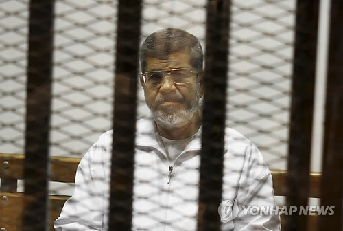| △ 무르시 이집트 전 대통령이 지난해 5월 8일 카이로의 경찰학교 법정 피고인 감금소에 앉아있는 모습. (AP=연합뉴스 자료사진) |