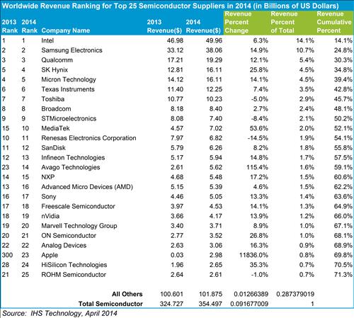 파운드리 업체까지 포함한 IC인사이츠의 조사에서는 SK하이닉스가 2014년 6위로 마이크론(5위)에 뒤진다. 그러나 IC인사이츠도 2015년 업계 순위 전망에서는 하이닉스가 마이크론에 앞설 것으로 예측했다.