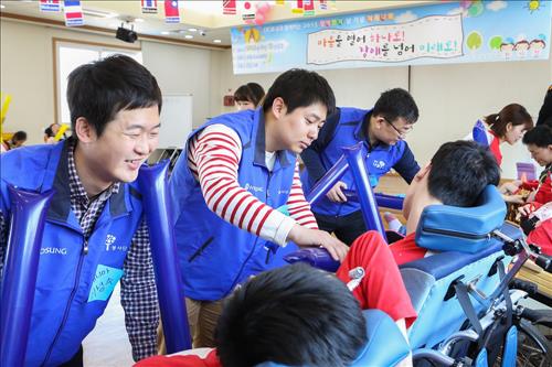 '마음을 열어 하나로, 장애를 넘어 미래로!!'를 주제로 열린 이번 체육대회에서 효성 임직원들은 평소 야외활동이 쉽지 않은 중증장애아들과 일대일로 짝을 맺어 여러 실외 프로그램을 함께 했다.
