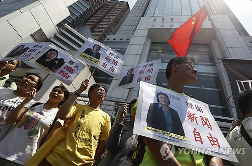| △ '가오위' 석방하라 (홍콩 AP=연합뉴스) 중국 베이징(北京) 제3중급법원이 17일 유명 반체제 여성 언론인 가오위(高瑜·71)에게 기밀 유출 혐의로 7년형을 선고한 가운데, 반중 시위자들이 이날 홍콩의 중국연락판공실 앞에서 가오의 사진 등을 들고 언론자유와 그녀의 석방 등을 요구하며 시위를 벌이고 있다. bulls@yna.co.kr Anti-Beijing protesters hold pictures of jailed veteran Chinese journalist Gao Yu during a rally outside Chinese central government's liaison office in Hong Kong Friday, April 17, 2015 as they demand press freedom and the release of Gao. A court in Beijing on Friday sentenced Gao to seven years in prison for leaking a top Communist Party document that outlined the leadership's resolve to aggressively curb civil society and press freedom. The placards read "Defend press freedom." (AP Photo/Kin Cheung) |