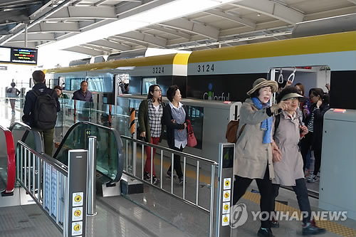 | △ 대구도시철도 3호선 신남역 (대구=연합뉴스) 김선형 기자 = 대구도시철도 3호선 신남역에서 승객들이 하차하고 있다. 2015.4.18 sunhyung@yna.co.kr |
