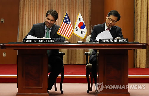 | △ 한미원자력협정 서명 (서울=연합뉴스) 전수영 기자 = 한미원자력협정이 4년 6개월여간의 협상 끝에 타결, 22일 오후 서울 세종로 외교부 청사에서 박노벽 외교부 원자력 협력대사와 마크 리퍼트 주한 미국대사가 협정에 가서명하고 있다. |