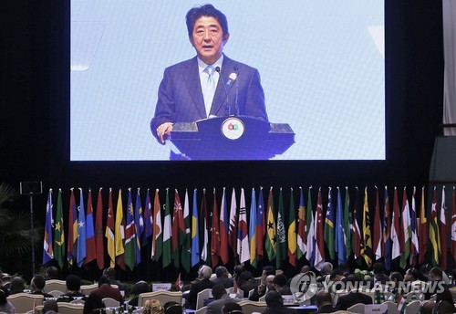 | △ 인도네시아 자카르타에서 열린 아시아·아프리카 정상회의에서 연설하는 아베 신조 일본 총리 (AP=연합뉴스) |