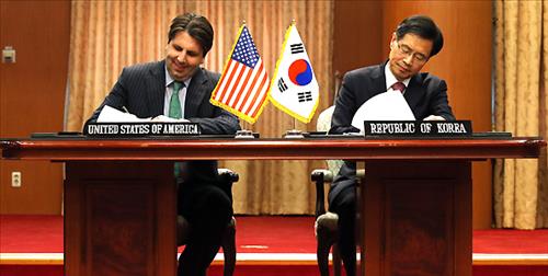 | △ 한미원자력협정 서명 (서울=연합뉴스) 전수영 기자 = 한미원자력협정이 4년 6개월여간의 협상 끝에 타결, 22일 오후 서울 세종로 외교부 청사에서 박노벽 외교부 원자력 협력대사와 마크 리퍼트 주한 미국대사가 협정에 가서명하고 있다. |