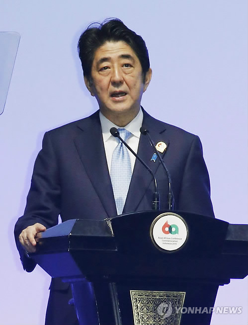 | △ 반둥회의에서 연설하는 아베 신조 일본 총리 (자카르타 교도=연합뉴스) 아베 신조(安倍晋三) 일본 총리가 22일(현지시간) 인도네시아 자카르타에서 열린 반둥회의 60주년 기념 아시아·아프리카 정상회의에서 연설하고 있다. sewonlee@yna.co.kr |