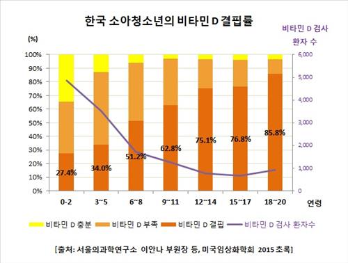3세 미만 유아 중에는 27.4%만 비타민D 결핍 상태였다. 그러나 3~5세 34%, 6~8세 51.2%, 9~11세 62.8%, 12~14세 75.1%, 15~17세 76.8%,18~20세 85.8% 등으로 비타민D 결핍증 진단율이 높아졌다.