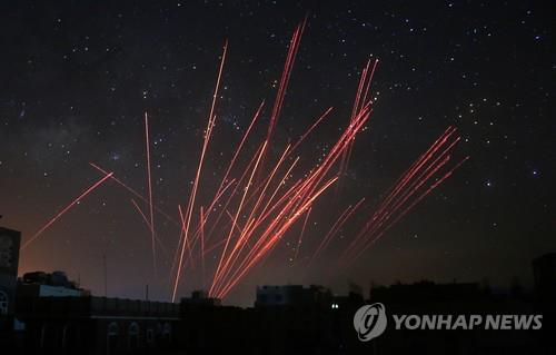 (서울=연합뉴스) 백나리 기자 = 아래 사진은 지난 17일(현지시간) AP통신의 카메라에 잡힌 예멘 수도 사나의 밤하늘이다. 한밤중에 불꽃놀이라도 하는 것 같지만 대공사격이 한창인 광경이다.