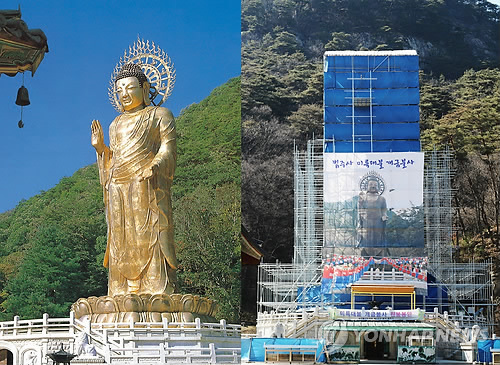 | △ 법주사 미륵대불 황금 옷 교체 (보은=연합뉴스) 박병기 기자 = 속리산 법주사에 있는 높이 33m의 미륵대불(왼쪽)이 올해 5월까지 개금불사된다. 사찰 측은 2002년 이 불상에 순금으로 된 막을 덧씌웠지만, 녹이 슬어 광채를 잃은 상태라고 설명했다. 오른쪽 사진은 26일 촬영한 공사 모습. 2015.3.26 bgipark@yna.co.kr |