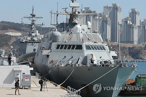 | △ 한미 연합훈련인 독수리 훈련에 참가한 미국 해군의 연안전투함(LCS)인 포트워스함(3천t)이 지난달 14일 해군작전사령부 부산작전기지에 입항해 있다. |