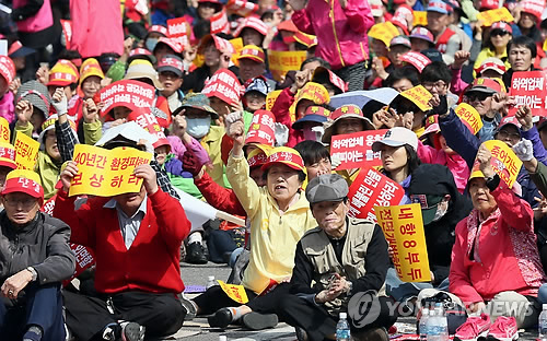 | △ 인천항비대위 "8부두 개방·국제여객터미널 존치해야" (인천=연합뉴스) 윤태현 기자 = 인천시 중구 주민 등으로 구성된 '국제여객터미널 존치·내항 8부두 전면 개방 비상대책위' 회원들이 23일 오후 중구 항동 인천우체국 앞 공영주차장에서 집회를 열고 있다. 2015.4.23 tomatoyoon@yna.co.kr |