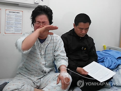 | △ 눈물 흘리는 세월호 단원고 실종자 가족 (안산=연합뉴스) 이복한 기자 = 세월호 단원고 실종자 조은화 양의 어머니 이금희씨가 23일 안산의 한 병원에서 선체 인양에 대한 기자회견을 하다 눈물을 흘리고 있다. 2015.4.23. bhlee@yna.co.kr |