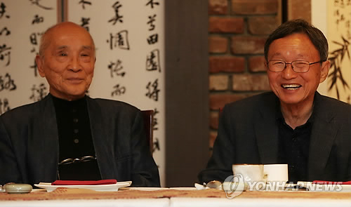 | △ 대화 나누는 한-일 대표 시인 (서울=연합뉴스) 양지웅 기자 = 23일 오후 서울 중구 태평로의 한 식당에서 열린 대시집 '모두 별이 되어 내 몸에 들어왔다' 출간 기념 기자간담회에서 저자인 다니카와 �타로(왼쪽), 신경림 작가가 대화를 나누고 있다. 2015.4.23 yangdoo@yna.co.kr |