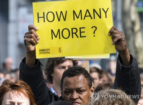| △ 벨기에 브뤼셀에서 23일(현지시간) EU 정상회의가 열리는 동안 회의장 밖에서 인권단체들이 지중해상 난민 참사를 방지하기 위한 대책 마련을 요구하는 시위를 벌이고 있다.(AP=연합뉴스) |