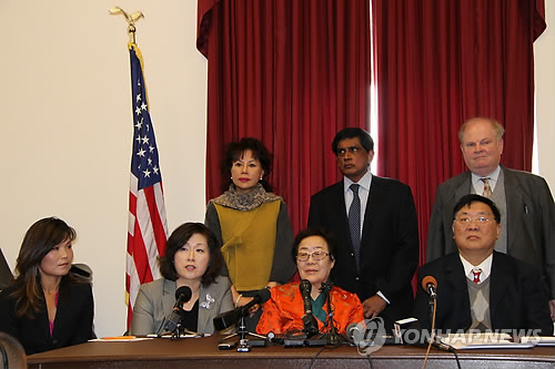 | △ 워싱턴 정신대대책위원회(회장 이정실) 주최로 23일(현지시간) 낮 미 의회 레이번 빌딩에서 열린 기자회견에서 워싱턴DC의 한국·미국·중국·대만 시민사회단체가 아베 신조 일본 총리의 역사왜곡 및 위안부 강제동원 부정을 강력히 비판하면서 오는 29일 미 의회 상하원 합동연설에서 공개 사죄할 것을 연대 압박했다. 왼쪽 앞줄 왼쪽부터 워싱턴한인연합회 임소정 회장, 워싱턴 정대위 이정실 회장, 이용수 할머니, 아태지역 2차세계대전 만행 희생자 추모회 제프리 천(중국계) 회장, 뒷줄 왼쪽부터 워싱턴 정대위 서옥자 고문, 국제사면위원회(AI) 워싱턴지부의 티 쿠마 국제옹호국장, 데니스 핼핀 미국 존스홉킨스대 국제관계대학원(SAIS) 연구원. 2015.4.24 |