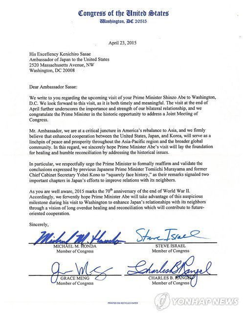 (워싱턴=연합뉴스) 노효동 특파원 = 미국 민주·공화당 소속 의원 25명이 23일(이하 현지시간) 연판장을 돌려 아베 신조 일본 총리가 일본군 위안부 문제를 비롯한 과거사 문제에 대해 공식으로 사과하라고 촉구했다.