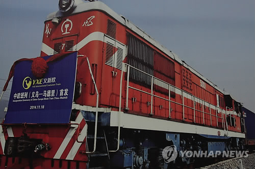 | △ 세계 최장 철도 '이신어우' (이우<중국 저장성>=연합뉴스) 한승호 특파원 = 중국 동부 저장성 이우시와 스페인 마드리드를 연결하는 총연장 1만3천52㎞의 세계 최장 철도 '이신어우'(義新歐) 국제열차. 이우시 이우서역이 소개한 개통식 장면을 재촬영한 사진. 2015.4.24 hsh@yna.co.kr |