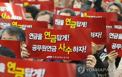 | △ 구호 외치는 전국공무원노조 조합원들 (서울=연합뉴스) 김주성 기자 = 전국공무원노조 동작구지부 조합원들이 24일 오전 서울 동작구청 강당에서 조합원 총회를 여는 방식으로 민주노총 총파업에 참여, 공무원연금 개혁에 반대하는 피켓을 들고 구호를 외치고 있다. 2015.4.24 utzza@yna.co.kr |