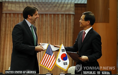 | △ 한미원자력협정이 4년 6개월여간의 협상 끝에 타결, 지난 22일 오후 서울 세종로 외교부 청사에서 박노벽 외교부 원자력 협력대사와 마크 리퍼트 주한 미국대사가 협정에 가서명한뒤 교환하고 있다. |