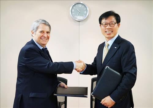 | △ 한국무역보험공사가 24일(현지시간) 브라질 수도 브라질리아에서 브라질개발은행(BNDES)과 '한국 수출기업의 중남미 진출 지원을 위한 금융협력 업무협약'을 맺었다.(오른쪽 김영학 무역보험공사 사장, 왼쪽 와그너 비튼코트 데 올리베라 브라질개발은행 부행장) |
