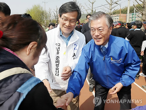 | △ 신동근 지원 나선 문재인 (인천=연합뉴스) 윤태현 기자 = 새정치민주연합 문재인 대표(오른쪽부터)와 4·29 재·보궐선거 인천 서구·강화을에 출마한 신동근 후보가 26일 오전 인천시 강화군 강화공설운동장에서 열린 '강화 50년생 체육대회'에서 시민과 악수하며 지지를 호소하고 있다. 2015.4.26 tomatoyoon@yna.co.kr |
