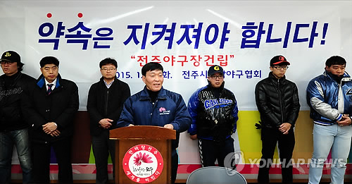 | △ 전주야구협회 "야구장 건립 약속 지켜야" (전주=연합뉴스) 홍인철 기자 = 전북 전주시야구협회(회장 강우석)는 13일 시청에서 기자회견을 열고 "전주시는 야구장 건립 약속을 지켜야 한다"고 주장했다. 이는 야구장과 육상장 등을 이전·건립하는 대신 종합경기장에 컨벤션센터를 우선 건립키로 한 전주시의 결정에 대한 항의의 뜻으로 받아들여진다. 2015.1.13. DB. ichong@yna.co.kr |
